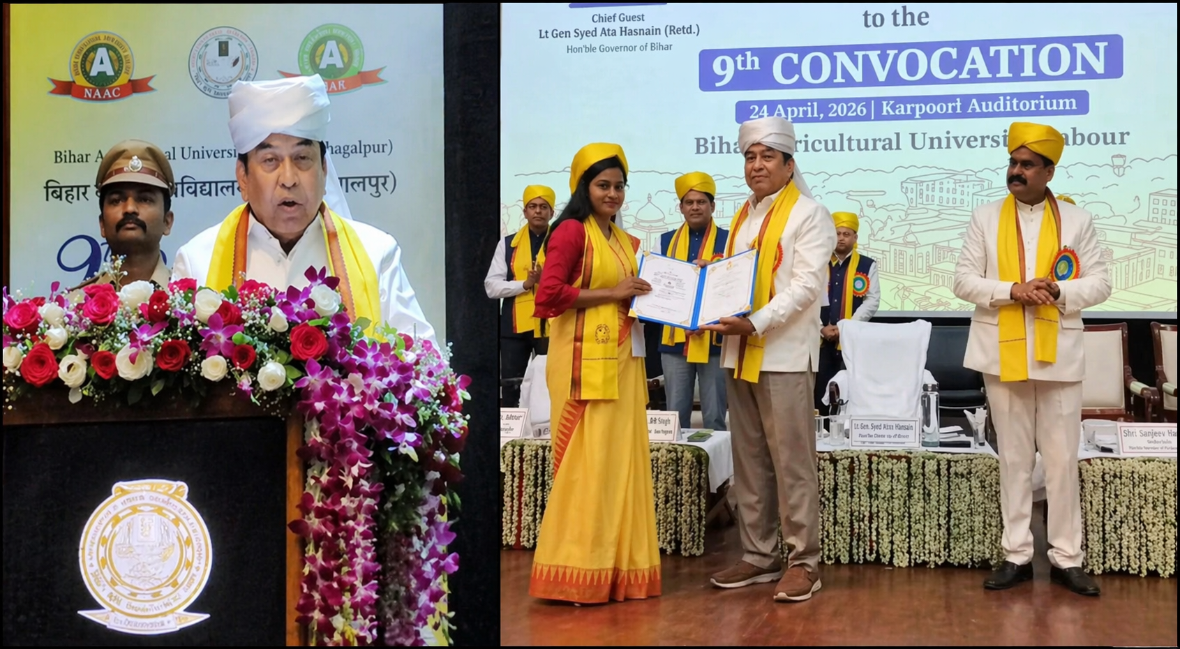 Bhagalpur News: बिहार कृषि विश्वविद्यालय (BAU), सबौर का प्रांगण आज खुशियों और गौरव के क्षणों से सराबोर रहा। अवसर था विश्वविद्यालय के नौवें दीक्षांत समारोह का, जहाँ बिहार के महामहिम राज्यपाल ने मुख्य अतिथि के रूप में शिरकत की। कार्यक्रम की शुरुआत पारंपरिक और भव्य तरीके से हुई, जहाँ राज्यपाल का स्वागत मिथिला और बिहार की पहचान ‘मखाना की माला’ पहनाकर किया गया।