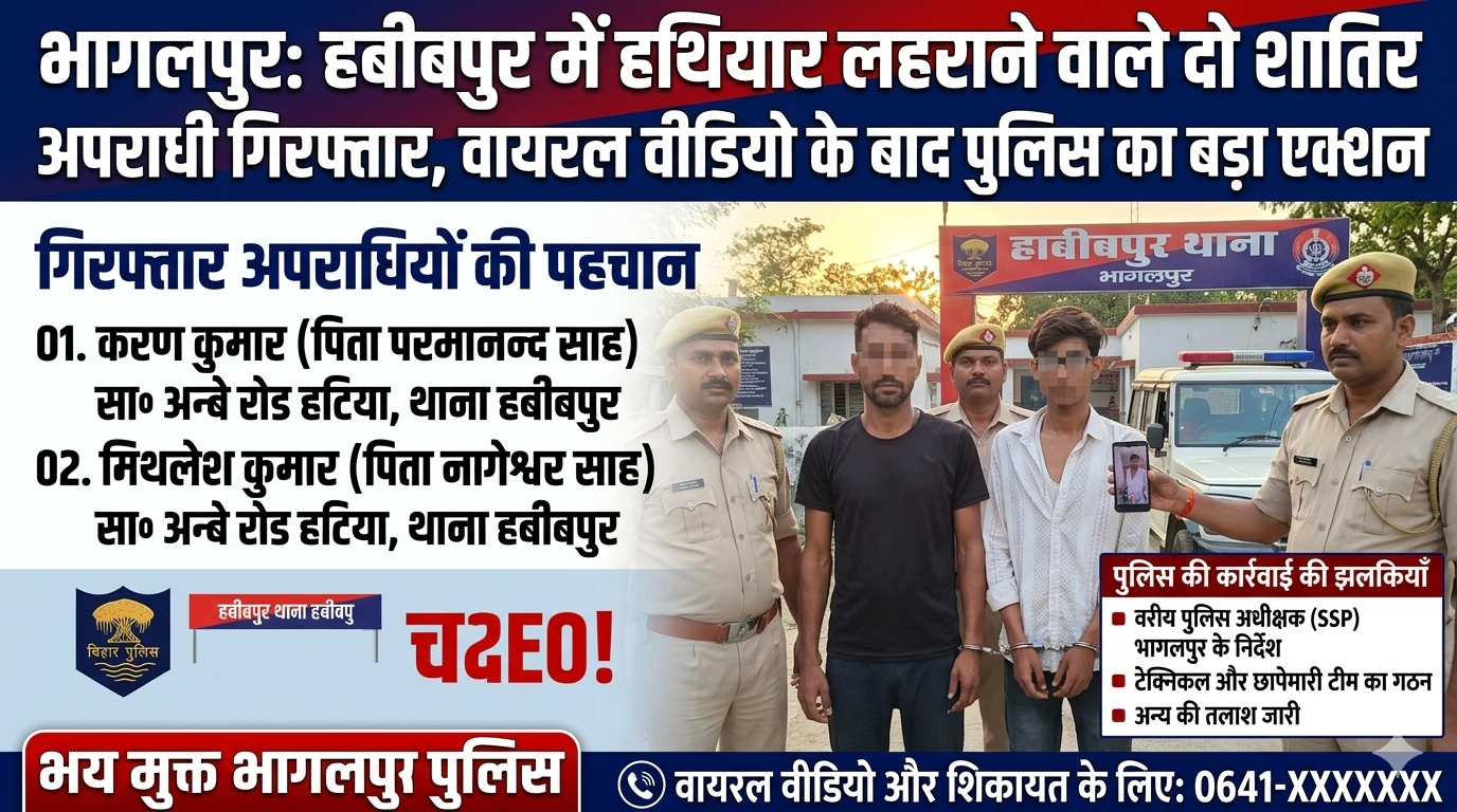 Bhagalpur News: भागलपुर जिले में अपराध और अपराधियों के खिलाफ चलाए जा रहे सघन अभियान के तहत हबीबपुर थाना पुलिस को एक बड़ी सफलता हाथ लगी है। सोशल मीडिया पर हथियार लहराने का वीडियो वायरल होने के बाद पुलिस ने त्वरित कार्रवाई करते हुए दो मुख्य आरोपियों को गिरफ्तार कर लिया है।