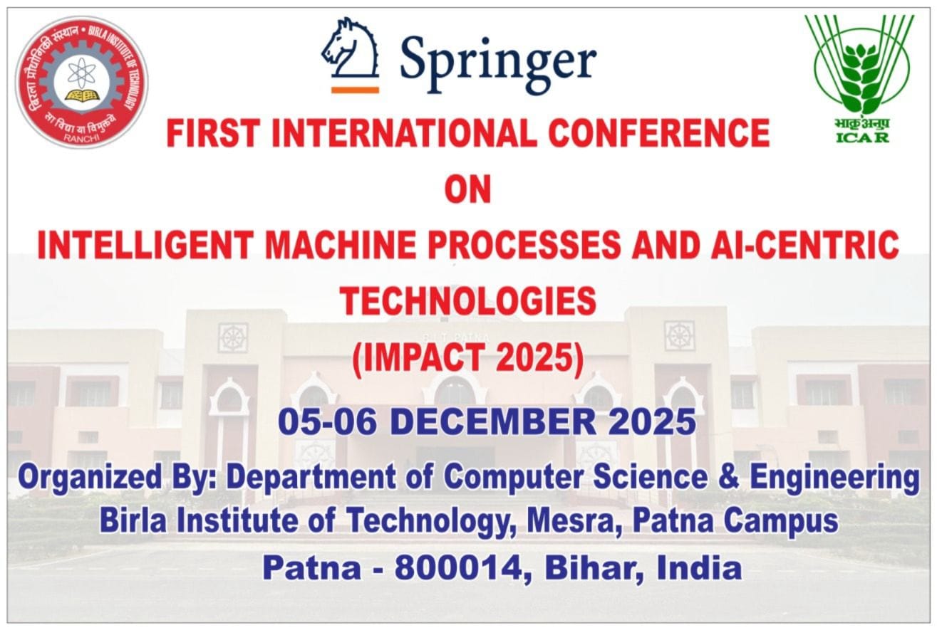 पटना, 26 नवंबर 2025। आर्टिफिशियल इंटेलिजेंस (AI) और स्मार्ट टेक्नोलॉजी के क्षेत्र में बिहार एक बड़ा कदम बढ़ाने जा रहा है। बिरला प्रौद्योगिकी संस्थान (BIT) मेसरा, पटना कैंपस 5–6 दिसंबर 2025 को IMPACT 2025 – इंटरनेशनल कॉन्फ्रेंस ऑन इंटेलिजेंट मशीन प्रोसेसेज़ एंड एआई-सेंट्रिक टेक्नोलॉजीज़ का आयोजन करने जा रहा है। यह आयोजन न सिर्फ तकनीकी शोध को मजबूत करेगा, बल्कि बिहार को एआई रिसर्च की वैश्विक मानचित्र पर नई पहचान देगा।