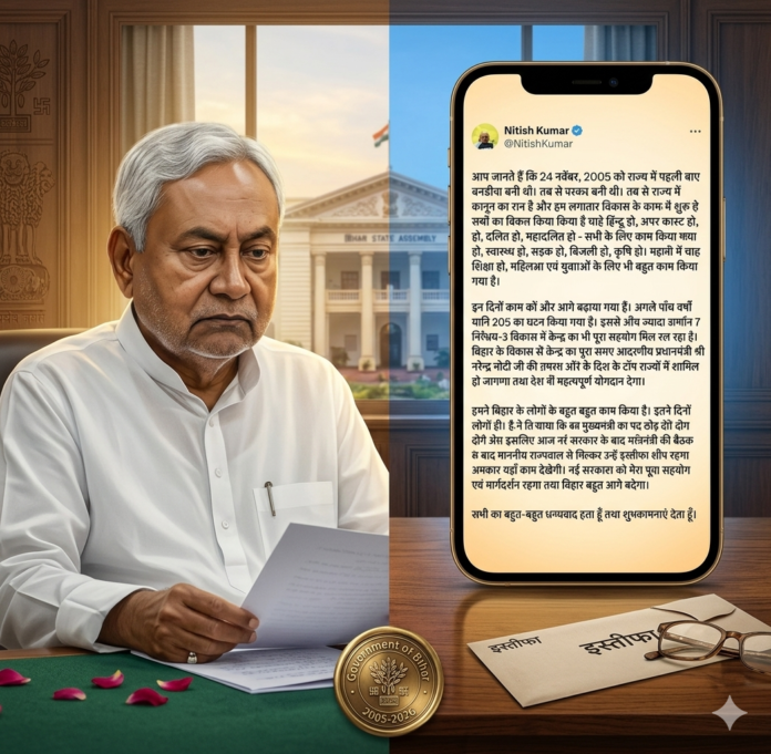 Bihar News: बिहार के राजनीतिक क्षितिज पर आज एक बड़े युग का सूर्यास्त हो गया। मुख्यमंत्री पद से इस्तीफा देने के तुरंत बाद नीतीश कुमार ने सोशल मीडिया पर एक लंबा और भावुक पोस्ट साझा किया है। इस पोस्ट में उन्होंने न केवल अपने इस्तीफे की पुष्टि की, बल्कि 2005 से लेकर अब तक के अपने विकास कार्यों का लेखा-जोखा भी जनता के सामने रखा।