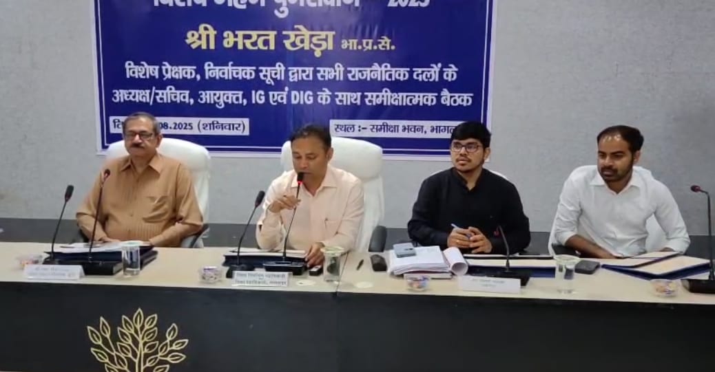 Bhagalpur News: भागलपुर में आगामी चुनाव की तैयारियों को लेकर शनिवार को मुख्य निर्वाचन प्रेक्षक भरत खेड़ा ने समीक्षा बैठक की। उनके आगमन पर जिलाधिकारी डॉ. नवल किशोर चौधरी ने समीक्षा भवन में उनका औपचारिक स्वागत किया। इसके बाद उन्होंने जिले में चुनाव से संबंधित व्यवस्थाओं की गहन समीक्षा की और विभिन्न राजनीतिक दलों के प्रतिनिधियों के साथ चर्चा की।