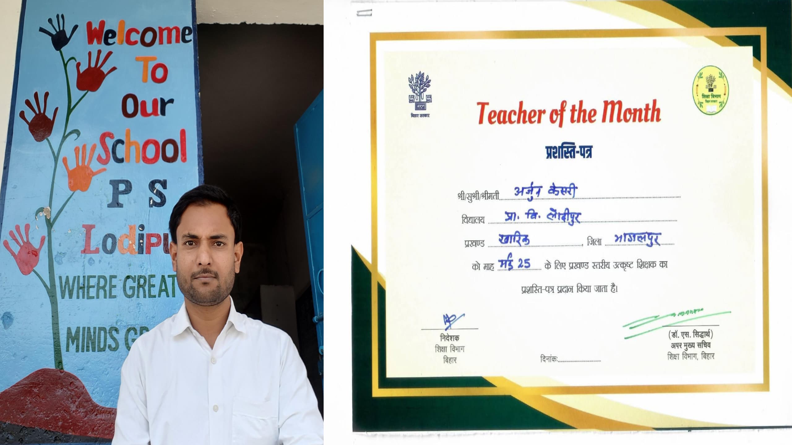 भागलपुर बिहार शिक्षा विभाग द्वारा “टीचर ऑफ द मंथ” के रूप में भागलपुर जिले के प्राथमिक विद्यालय लोदीपुर, खरीक के शिक्षक अर्जुन केशरी को मई 2025 के लिए चुना गया है। यह सम्मान उन्हें शिक्षण में अपनाई गई रचनात्मक तकनीकों और छात्रों के प्रति समर्पण के लिए दिया गया।