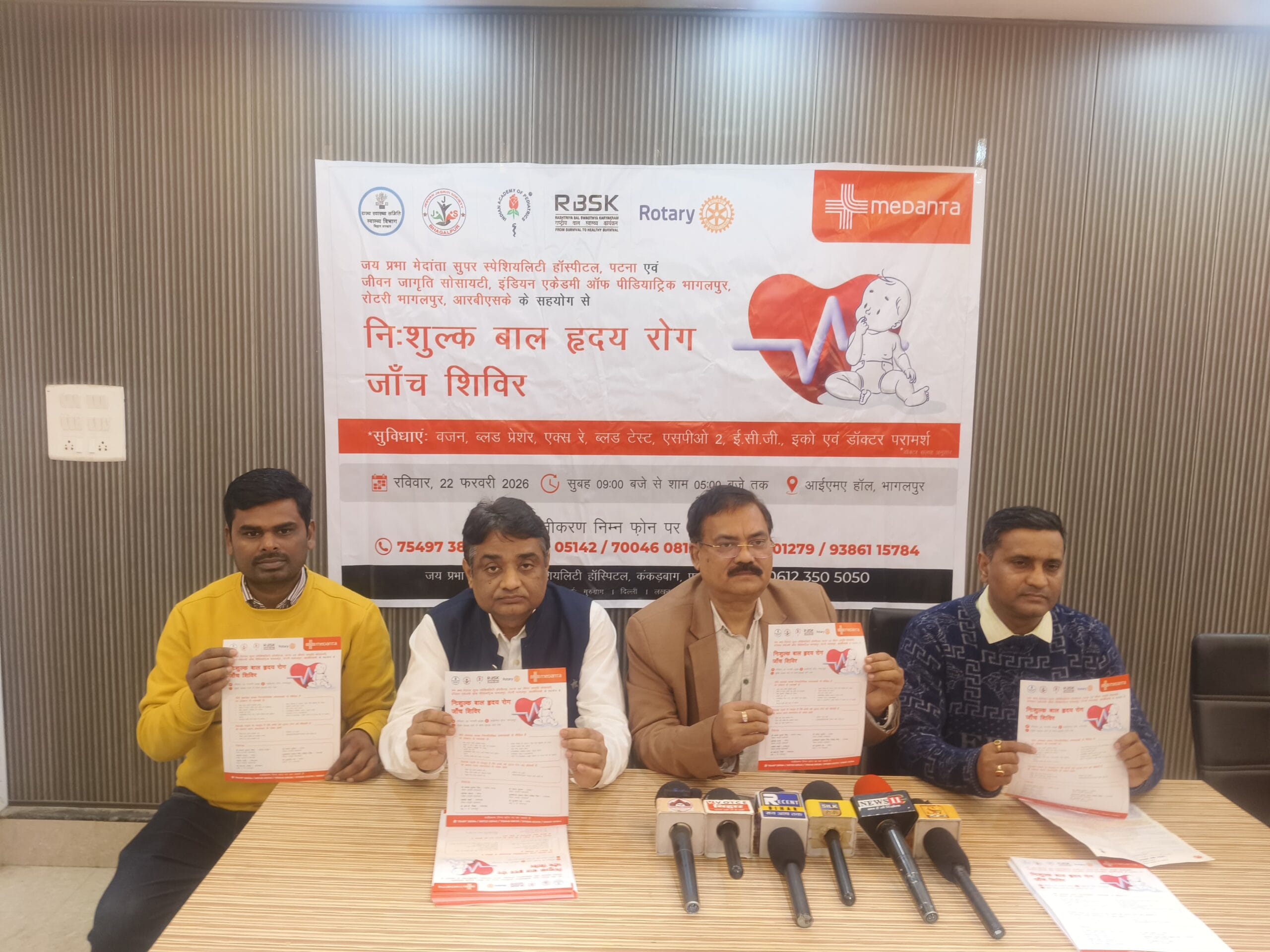 Bhagalpur News: शहर में बच्चों के हृदय रोग की समय पर पहचान और इलाज सुनिश्चित करने के उद्देश्य से निःशुल्क बाल हृदय रोग जाँच शिविर आयोजित किया जा रहा है। इसको लेकर शुक्रवार को भागलपुर में एक प्रेस कॉन्फ्रेंस आयोजित कर विस्तृत जानकारी दी गई। यह विशेष शिविर रविवार, 22 फरवरी को आईएमए हॉल, भागलपुर में सुबह 9 बजे से शाम 5 बजे तक चलेगा।
