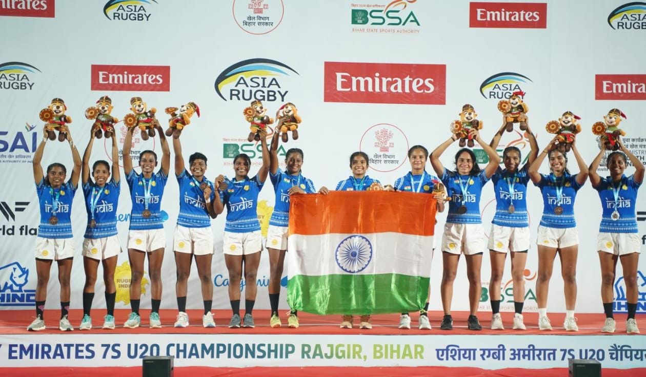 राजगीर/बिहार: एशिया रग्बी एमिरेट्स अंडर-20 सेवन्स चैंपियनशिप में भारत की अंडर-20 महिला टीम ने शानदार खेल दिखाते हुए कांस्य पदक अपने नाम किया। मेजबान भारत ने तीसरे स्थान के मुकाबले में उज्बेकिस्तान को 12-5 से हराकर यह ऐतिहासिक जीत दर्ज की। यह पहली बार है जब भारत ने इस टूर्नामेंट की मेजबानी की और घरेलू मैदान पर महिला टीम ने पदक जीता।