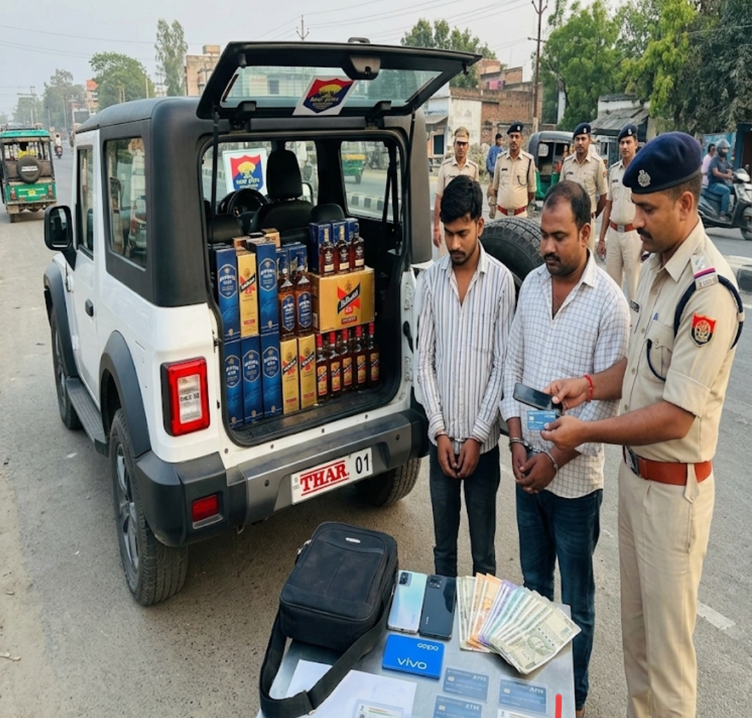 जैसे ही थार गाड़ी वहाँ पहुँची, पुलिस ने उसे घेराबंदी कर रोक लिया। तलाशी लेने पर गाड़ी के अंदर छिपाकर रखी गई भारी मात्रा में विदेशी शराब बरामद हुई।