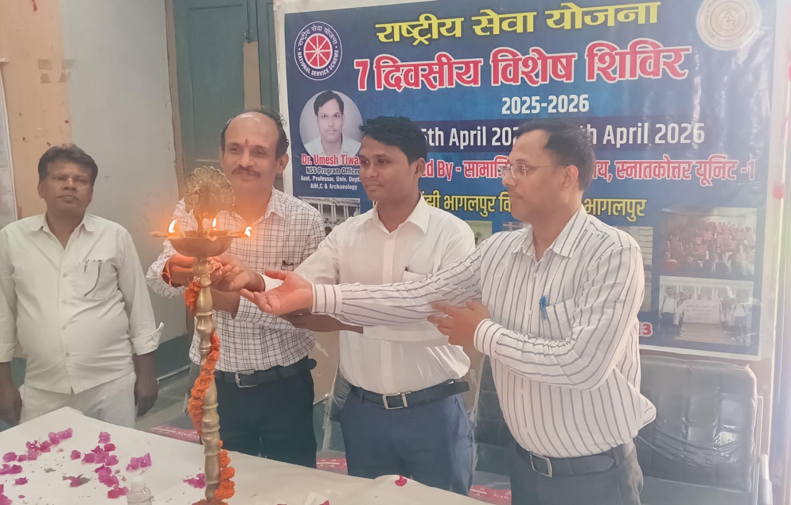 कार्यक्रम का विधिवत उद्घाटन मुख्य अतिथि, TMBU के स्टेट पदाधिकारी डॉ. जैनेंद्र कुमार, प्रभारी विभागाध्यक्ष डॉ. पवन शेखर और कार्यक्रम पदाधिकारी डॉ. उमेश तिवारी द्वारा संयुक्त रूप से दीप प्रज्वलित कर किया गया। सत्र की शुरुआत विश्वविद्यालय के कुलगीत और NSS लक्ष्य गीत के साथ हुई।