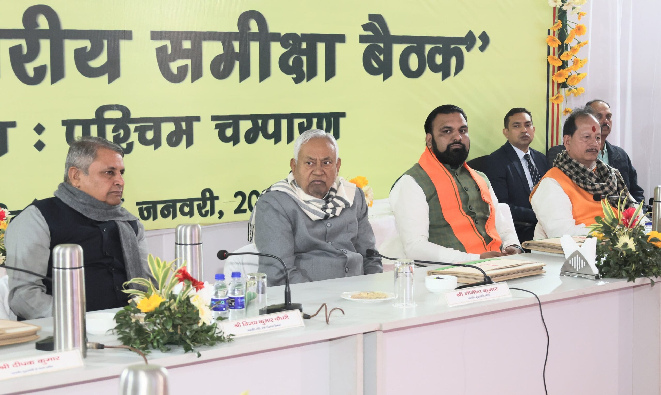 इस अवसर पर उप मुख्यमंत्री सम्राट चौधरी, उप मुख्यमंत्री विजय कुमार सिन्हा, जल संसाधन एवं संसदीय कार्य मंत्री विजय कुमार चौधरी, सांसद डॉ. संजय कुमार जायसवाल, सांसद सुनील कुमार, विधायक समृद्ध वर्मा सहित कई वरिष्ठ अधिकारी एवं जनप्रतिनिधि उपस्थित थे। मुख्यमंत्री ने अधिकारियों से कहा कि सभी योजनाओं का लाभ आम नागरिक तक पहुंचे और बिहार को देश के सर्वाधिक विकसित राज्यों की श्रेणी में लाया जाए।