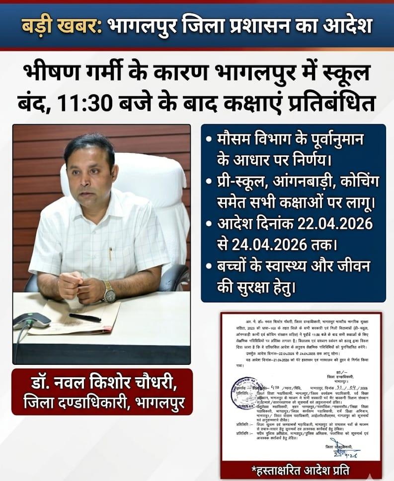 Bhagalpur News: बिहार के भागलपुर जिले में सूरज की तपिश और भीषण गर्मी ने आम जनजीवन को अस्त-व्यस्त कर दिया है। बच्चों के स्वास्थ्य पर इसके प्रतिकूल प्रभाव को देखते हुए जिलाधिकारी डॉ. नवल किशोर चौधरी ने एक महत्वपूर्ण आदेश जारी किया है। मौसम विभाग के पूर्वानुमान और लू (Heatwave) की स्थिति को देखते हुए जिले के सभी शिक्षण संस्थानों के समय में बदलाव कर दिया गया है।