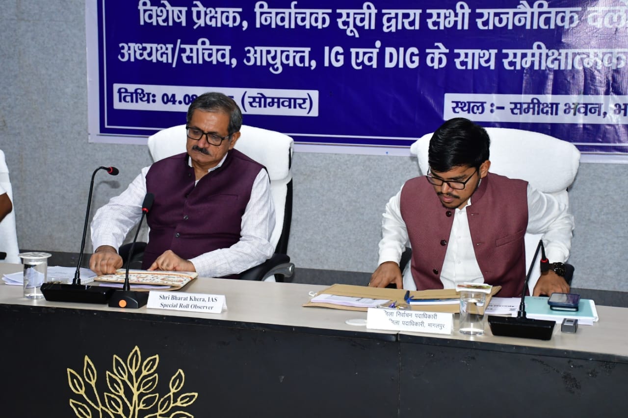 भागलपुर: भागलपुर में विधानसभा निर्वाचन 2025 को लेकर मतदाता सूची के विशेष गहन पुनरीक्षण (SIR) की प्रगति की समीक्षा के लिए विशेष निर्वाचक सूची प्रेक्षक श्री भारत खेड़ा (भा.प्र.से.) की अध्यक्षता में एक महत्वपूर्ण बैठक आयोजित की गई। इस दौरान सभी मान्यता प्राप्त राजनीतिक दलों के प्रतिनिधियों से फीडबैक लिया गया और सुधारात्मक सुझावों पर चर्चा की गई।