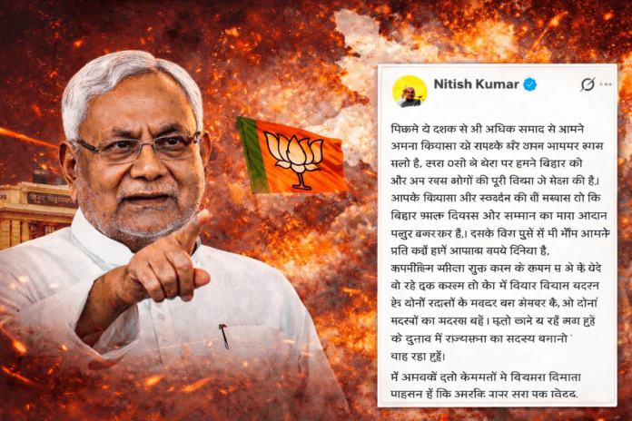 Patna News: पटना: बिहार की राजनीति में आज बड़ा घटनाक्रम सामने आया है। मुख्यमंत्री Nitish Kumar ने सोशल मीडिया पोस्ट के जरिए स्पष्ट कर दिया है कि वे इस बार राज्यसभा का चुनाव लड़ना चाहते हैं। उनके इस सार्वजनिक बयान के बाद राज्य की सियासत में नई बहस छिड़ गई है और सत्ता परिवर्तन की अटकलें तेज हो गई हैं।