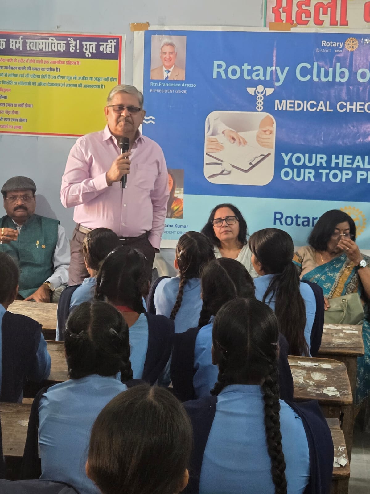 रोटेरियन पूजा ठाकुर ने मासिक धर्म के दौरान स्वच्छता बनाए रखने और मूत्र संक्रमण (UTI) से बचाव के उपाय साझा किए। रोटेरियन प्रेमेन्द्र मोहन ठाकुर ने छात्राओं को शिक्षा के महत्व और उज्ज्वल भविष्य के निर्माण के लिए प्रेरित किया।